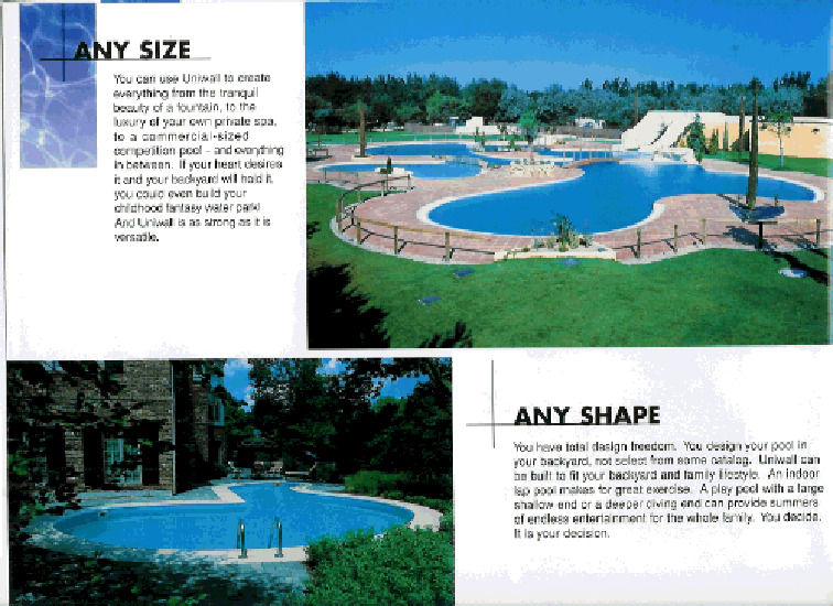 | You have total design freedom. You design your pool in your backyard, not select from some catalog. Uniwall can be built to fit your backyard and family lifestyle. An indoor lap pool makes great exercise. A play pool with a large shallow end or a deeper diving end can provide summers of endless entertainment for the whole family. You decide. It is your decision. |