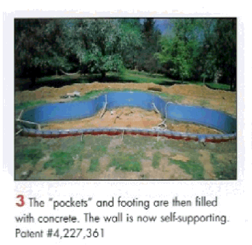 | 3. The "pockets" and footing are then filled with concrete. The wall is now self-supporting. Patent # 4,227,361 |